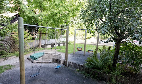 Ein gutgeschützter und sonniger Innenhofgarten mit diversen Spielgeräten, wird jeden Tag, von allen Kindern und bei jedem Wetter genutzt.